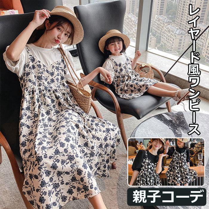 親子コーデ 親子 お揃い ワンピース 重ね着風 半袖 レイヤード風 ママ 娘 子供服 かわいい キッズ 女の子 ガールズ 春 夏 旅行 リンクコーデ おしゃれ 花柄 親子ペアルック 家族お揃い