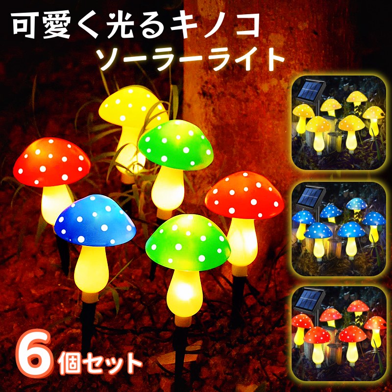 6のキノコがお庭で可愛く鮮やかに光る童話風なガーデンソーラーライト★送料無料!★