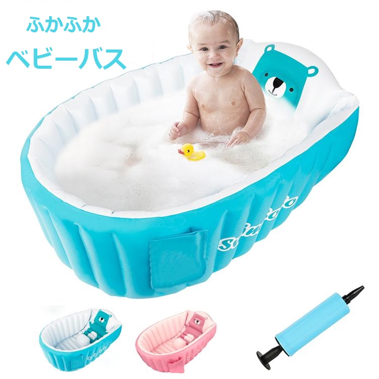 ベビーバス ふかふかベビーバス エアポンプ付き 空気入れ ベビーケア おふろ用品 新生児 お風呂 沐浴 コンパクト 持ち運び便利 かわいい おしゃれ 新生児~3歳頃 収納便利