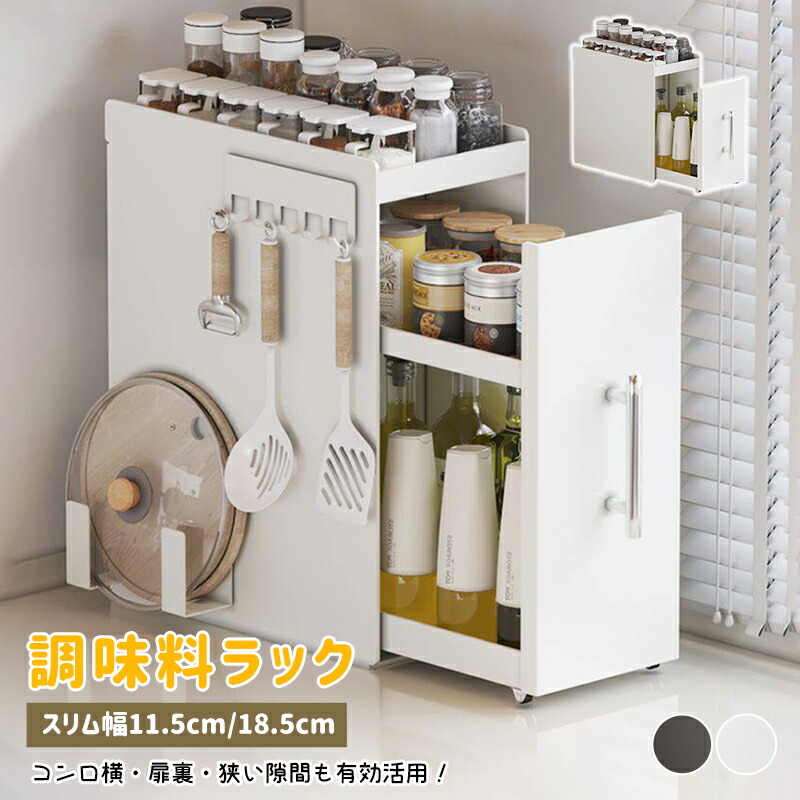 見せない収納で、キッチンが一気にスッキリ!コンロ横・扉裏・狭い隙間も有効活用!スリムデザインで調味料をまとめて隠せる、キッチン収納の宝物です。