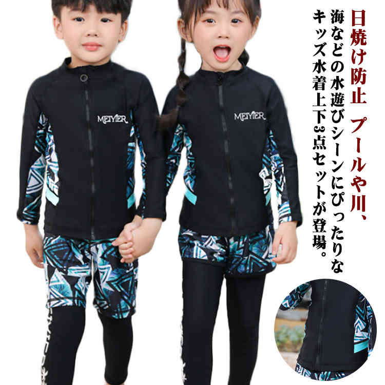 キッズ 水着 3点セット セパレート 女の子 男の子 長袖 ラッシュガード ショートパンツ ロングスパッツ ジップアップ ストレッチ 伸縮 UV対策 日焼け防止 海水浴 プール かわいい スイムウェア