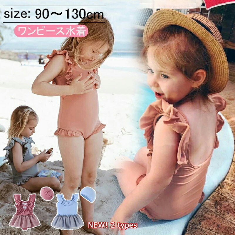 水着 女の子 ワンピース ベビー スイムキャップ 無地 ピンク 子供用水着 キッズ水着 こども 女児 みずぎ 可愛い プール スクール水着 フリル 90 110 120 130 100