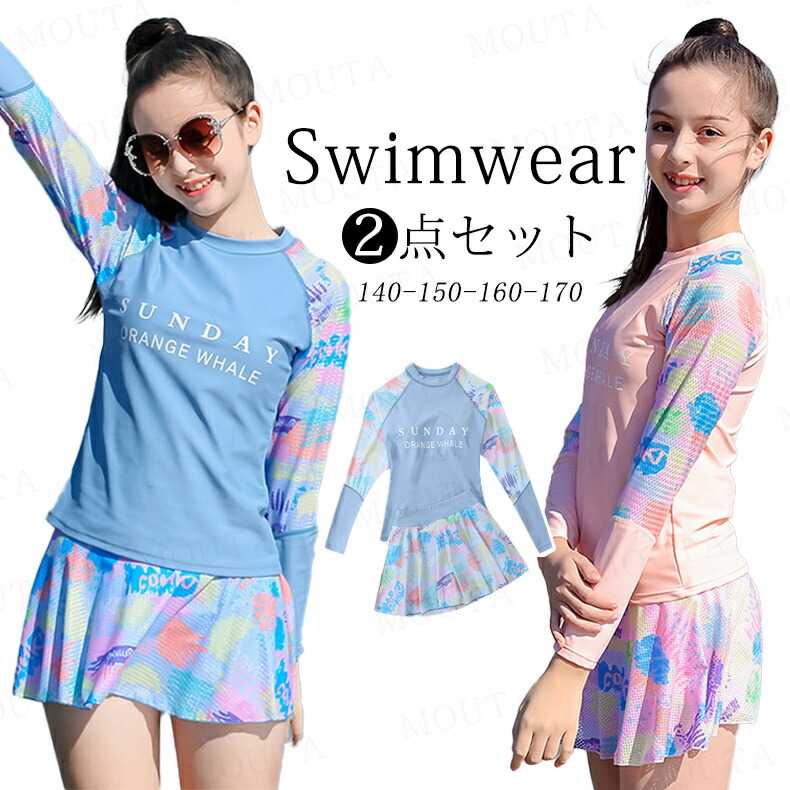 女の子 水着 長袖 セパレート 2点セット 体型カバー レデイース スイムウェア トップス スカート 胸パッド付き ショーツ一体型 中学生 高校生 フィットネス 上下セット こども ガールズ 日焼け