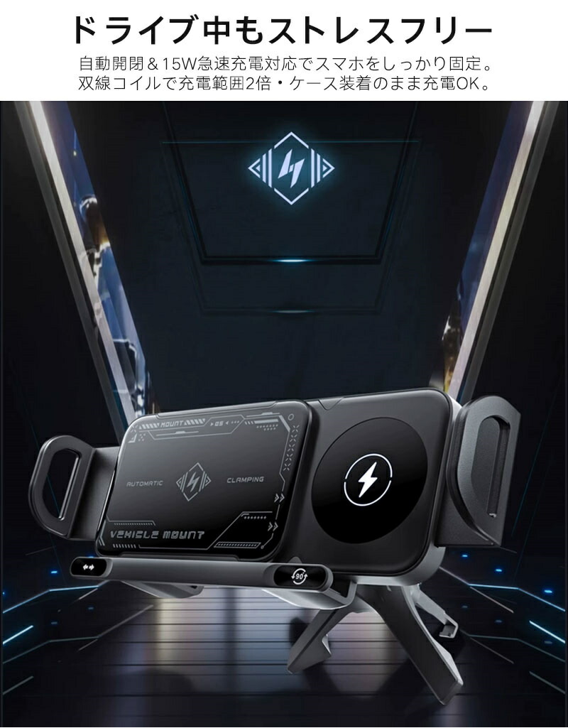 安全運転サポート!車載 折りたたみ&360度回転 15急速ワイヤレス充電スタンド。スマホももワンタッチ固定!/普通車対応でカーナビ代わりに最適。ハンズフリー充電で快適ドライブ。