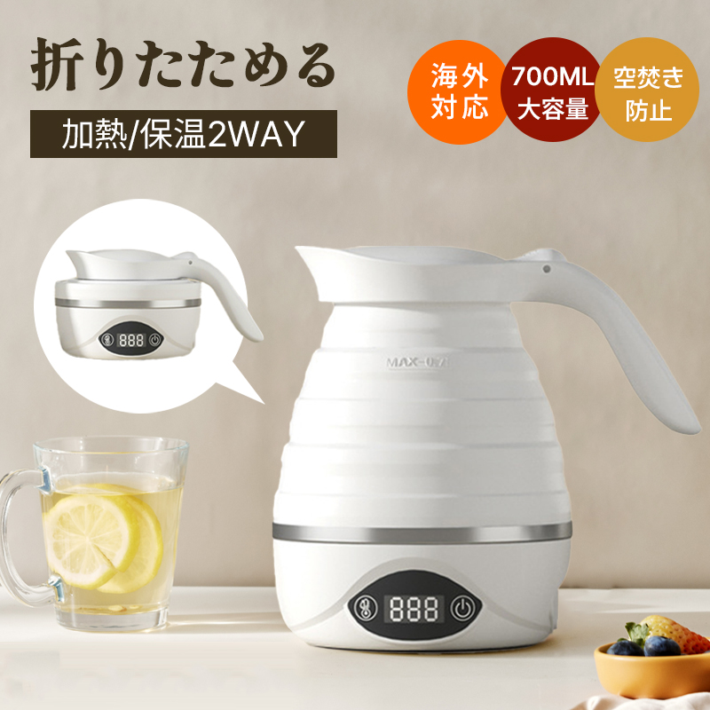 折りたたみケトル 電気ケトル 0.7L 持ち運びケトル 持ち運び キャンプ アウトドア シリコン ケトル トラベルケトル 電気 折りたたみ 旅行 便利グッズ 温度調節 自動 保温 車中泊 海 湯沸かし
