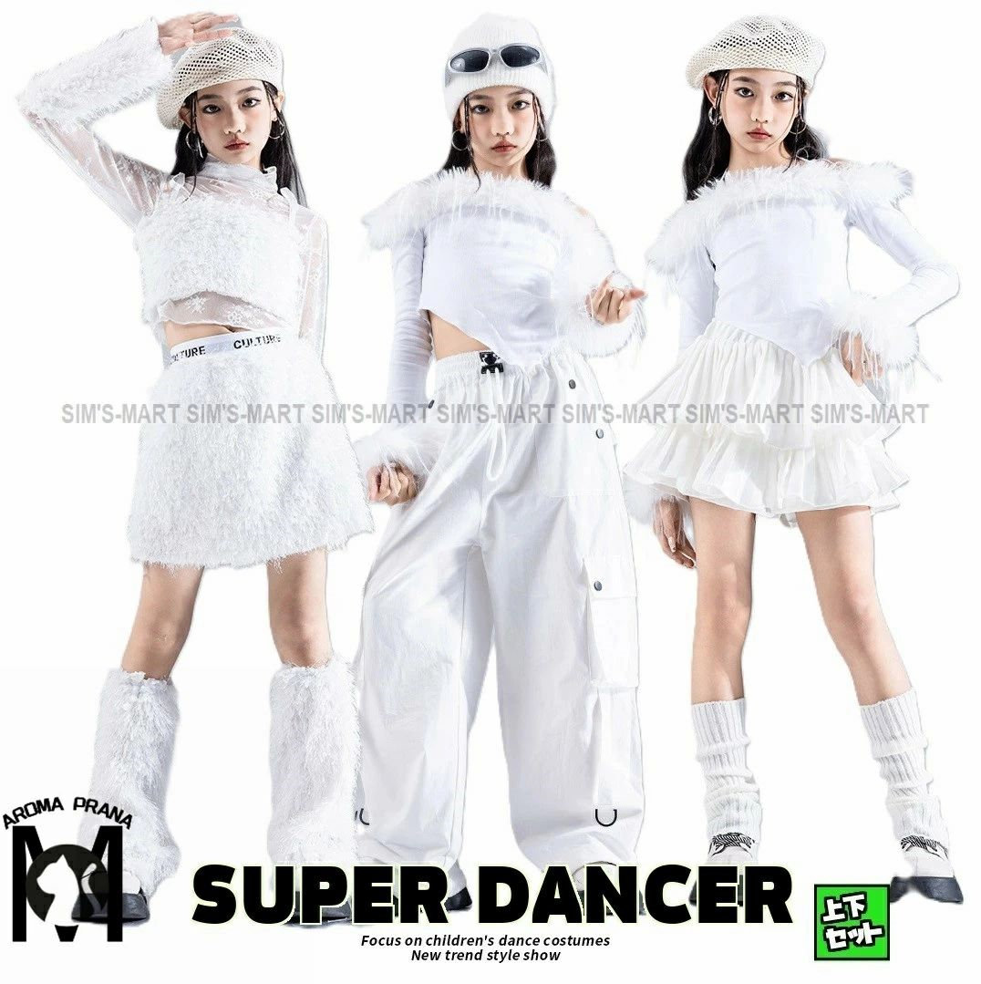 ダンス衣装 ガールズ 衣装 白 K-POP 韓国 ジャズ キッズダンス衣装 セットアップ ふわふわ ファー オフショルトップス フリルスカート 子供ダンス服 ダンスウェア パンツ