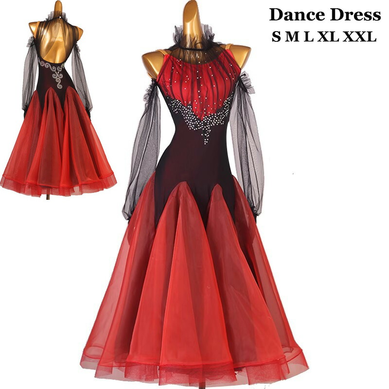 社交ダンス衣装 ダンスウェア 発表会ドレス ゴージャス 黒*赤 レトロ ワンピース 長袖 チュール 背中空き きれいめ 上質 競技ドレス スタンダードドレス ワルツ サンバ ラテンダンス ステ ルンバ