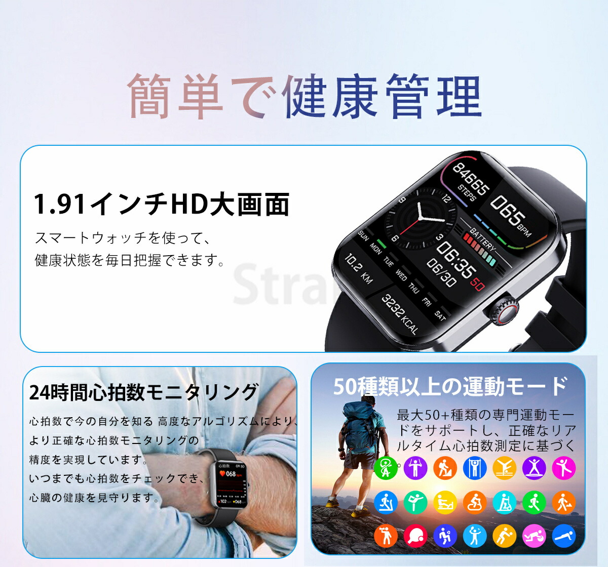 1.91インチのカラー スクリーンを搭載し、時間やメッセージなどの内容がよりり鮮明に表示され、自動輝度調整機能が付き、どんな場所でも見やすいスマートウォッチ。