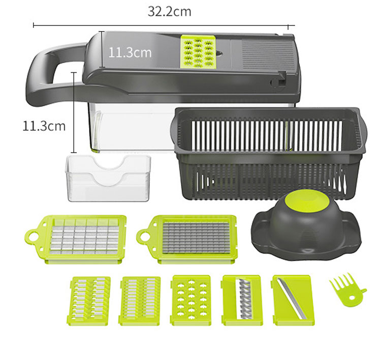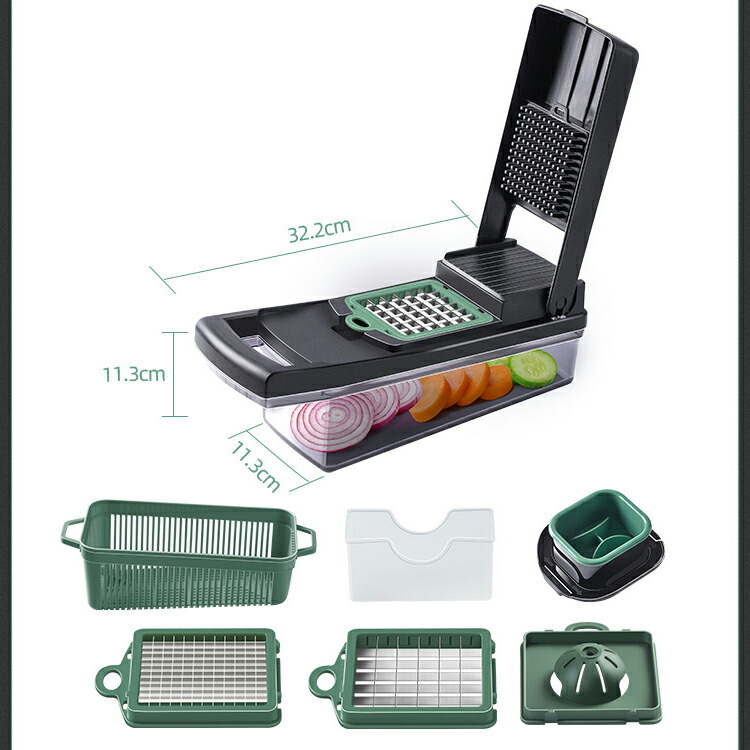 【グレー ブルー グリーン】15点セット:薄切り/千切り/太切り/大きな角切り/小さな角切り/卵白分離器/切り花/ニンニク磨き/ハンドホルダー/排水バスケット/収納ボックス/押圧器/本体/ブレード収納/クリーンブラシ