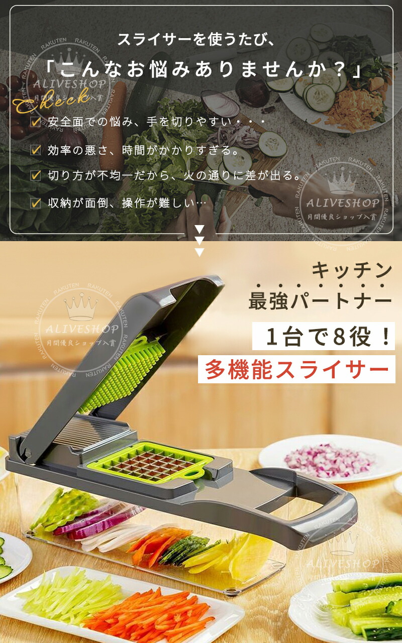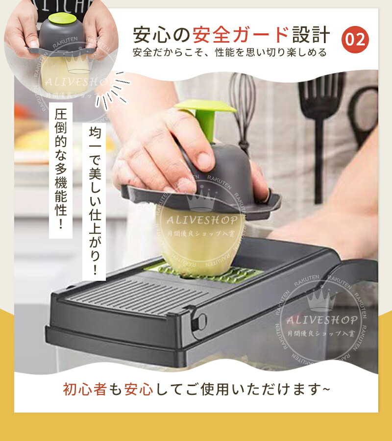 スライサーには食品グレードの素材を採用しており、エコで環境に優しい。安全ホルダーで小さくなった野菜を掴めることで、手を切る心配まったくないで、安全にスライスできます。容器の底部には滑り止め付きによって、スライスしたり、カットしたりの時の安定性を向上します。野菜が飛び散らず便利です。