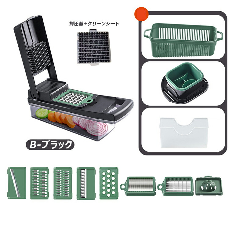 【B-ブラック B-ブルー B-グリーン】15点セット:薄切り/千切り/太切り/大きな角切り/小さな角切り/卵白分離器/切り花/ニンニク磨き/ハンドホルダー/排水バスケット/収納ボックス/押圧器/本体/ブレード収納/クリーンシート