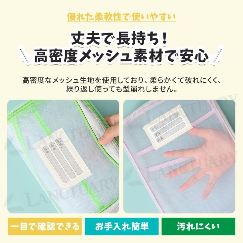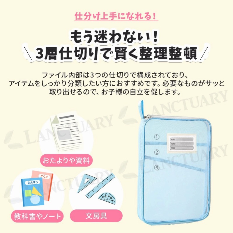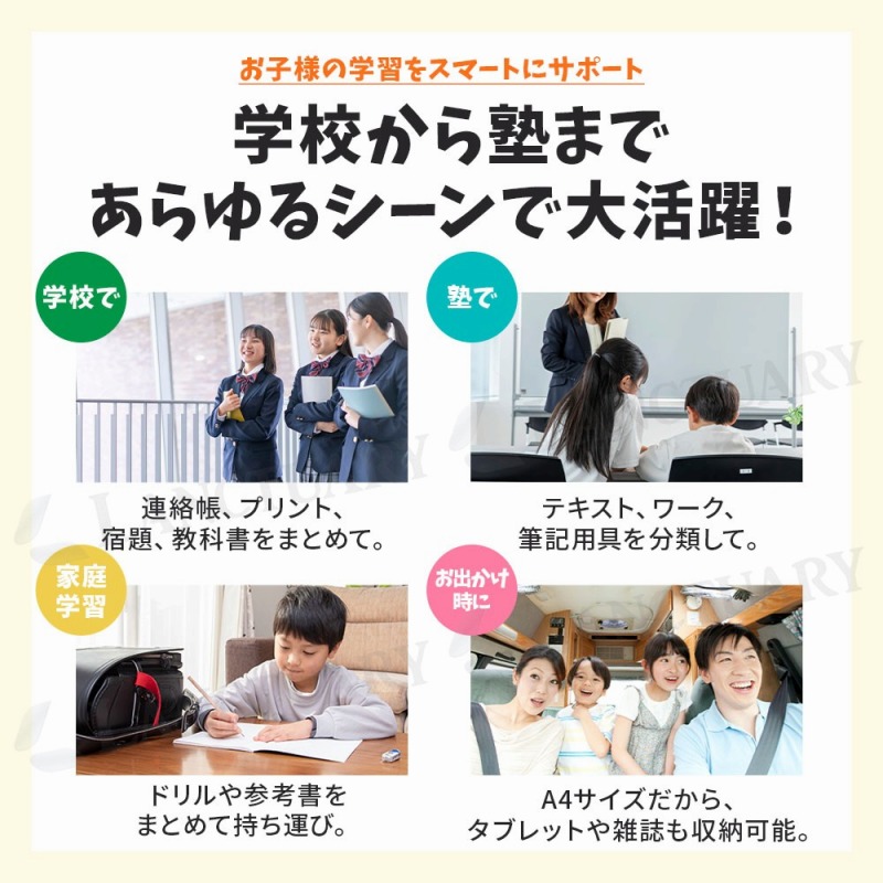 また、厚さ4cmのゆったりとしたマチと立体的な構造により、A4サイズの教科書やワークブックが最大8冊も収納可能です。マチがしっかりしているため、たくさんの教材を入れても型崩れしにくく、大切な書類の角が折れる心配もありません。ランドセルやカバンの中をすっきりと保ちながら、必要なものをしっかり持ち運べる頼れる存在となります。さらに、内部は3つの層に分かれており、宿題、テスト、プリント類、ノート、教科書、文具といった項目ごとに分類して収納できます。これにより、「あれどこに行った 」と探す手間を省き、学習効率の向上をサポートします。