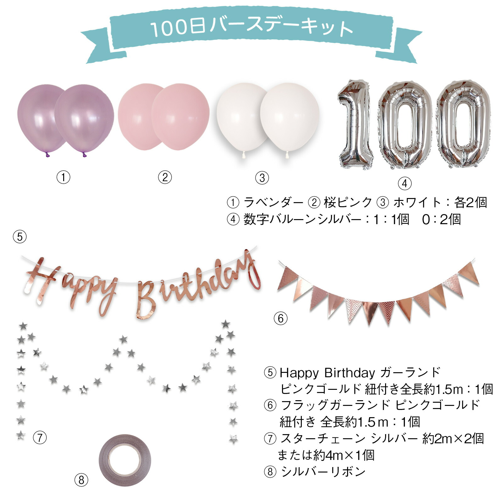 100日 飾り お食い初め バルーン A. ゴールドミントグリーン B. ゴールドチョコレート E. シルバーコンフェッティ F. ラベンダーピンク