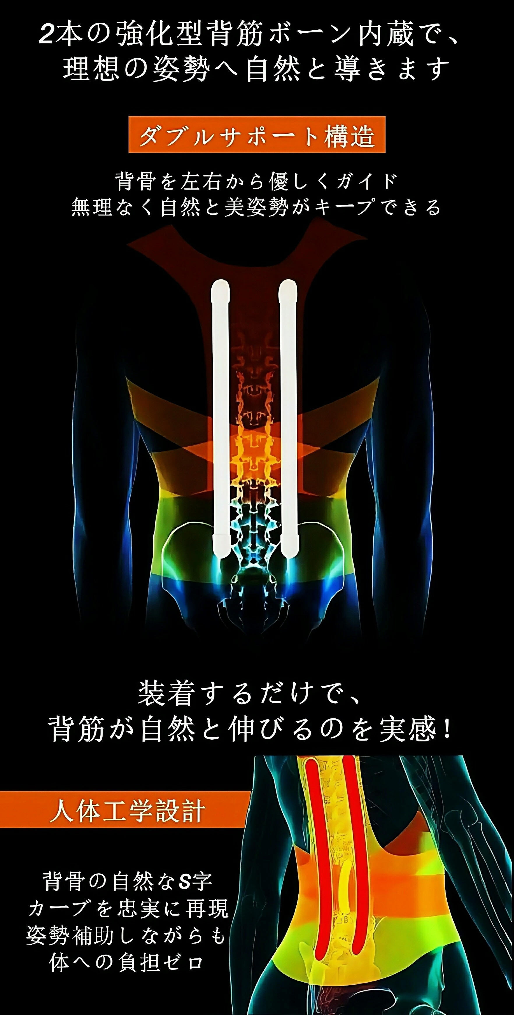 背骨を左右から優しくガイド無理なく自然と美姿勢がキ一プできる
