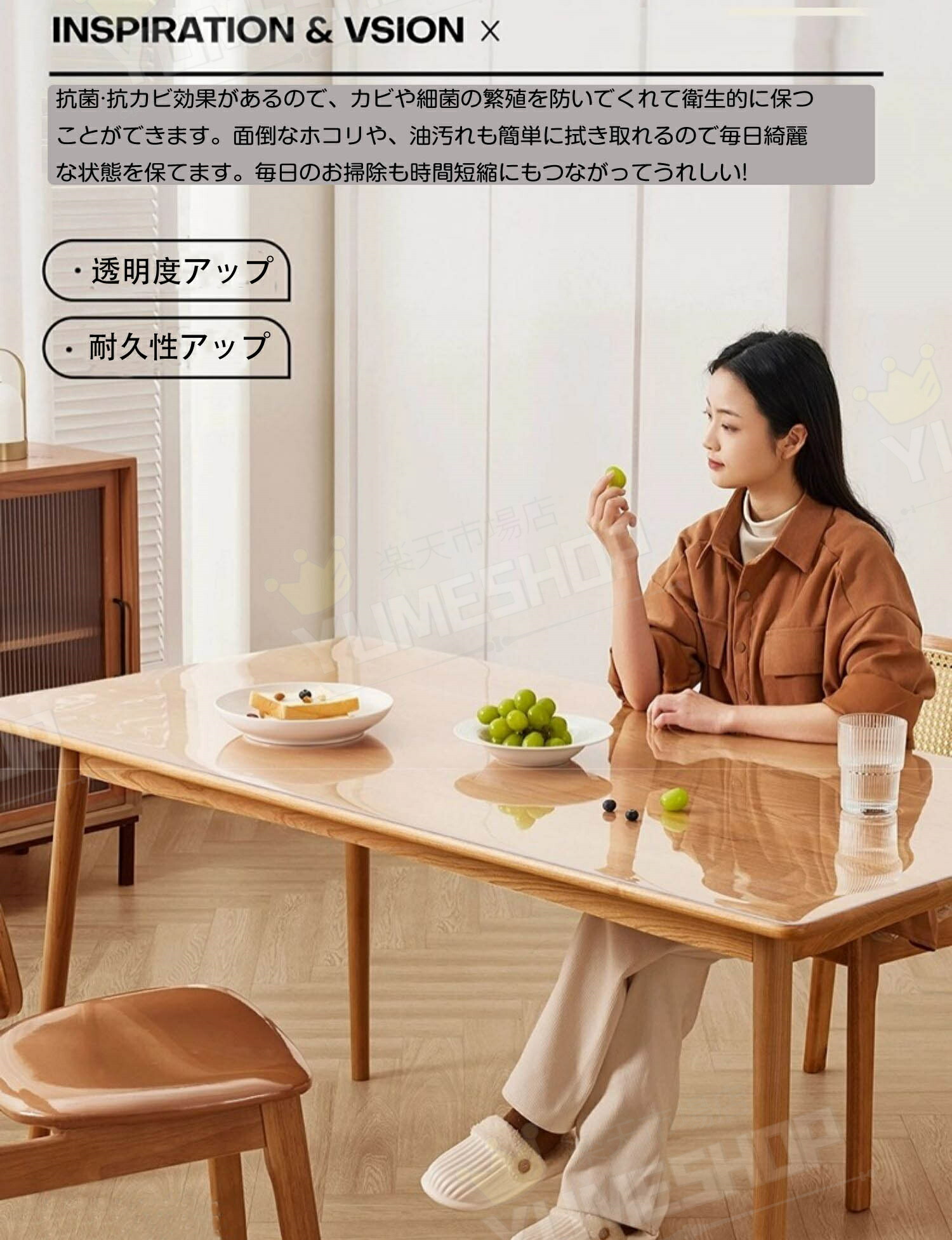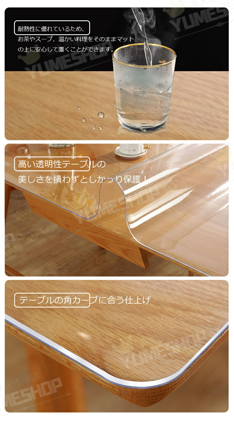 【透明度が高く、高機能性、安全安心】:透明なのでテーブルの見た目を変えることなくキズ・汚れから保護できます。防水、耐油性、耐熱性、高温耐性、清掃が簡単透明なテーブルクロス。適度な厚みで、テーブルクロス以外にチェアマットとしてもご利用いただけます。