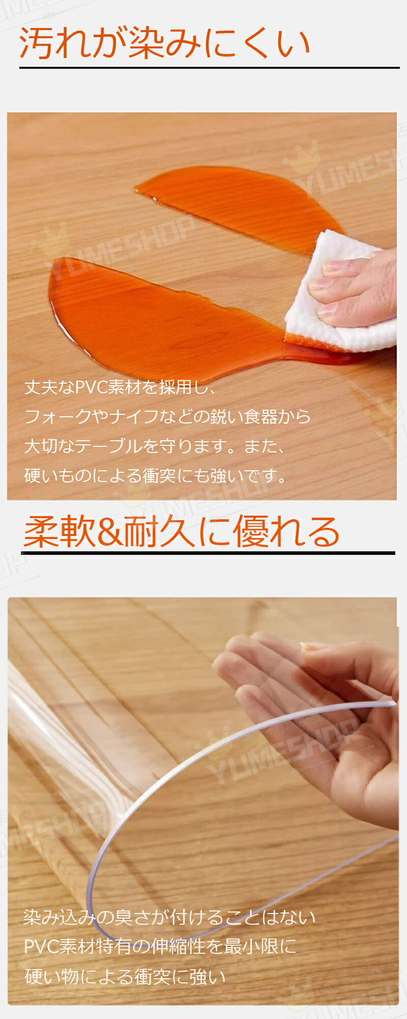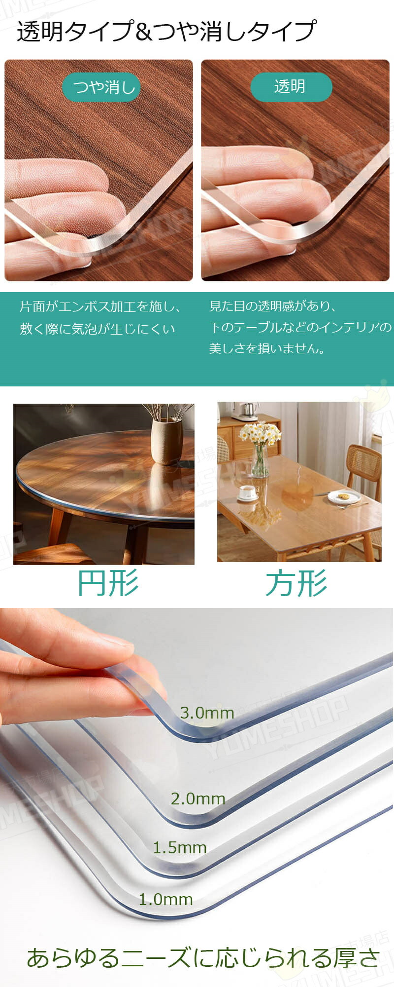 【PVC テーブルマット】:超高透明軟質PVC(塩化ビニール)を採用。ビニールの柔らかさはそのままに、傷・汚れがつきにくく変形しにくいといったメリットがあります。環境に優しく、健康なビニール材料、無臭!収縮しません!食品レベルPVC素材を採用し、こどもや老人が安心にご利用いただけ。安全安心で、食品と直接に接触することができます。厚さ:1mm、1.5mm、2mm、3mmあなたの好みに従って適切な厚さを選びなさい。