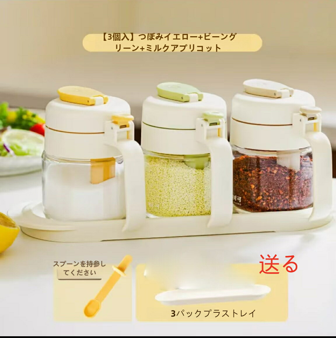 調味料入れ スプーン付き 調味料入れセ 保存容器 調味料入れ 調味料入れセット 豊富 イエロー グリーン ベージュ イエロー+グリーン イエロー+ベージュ グリーン+ベージュ 3色セット(トレイ付) 1点セット 2点セット 3点セット(トレイ付)
