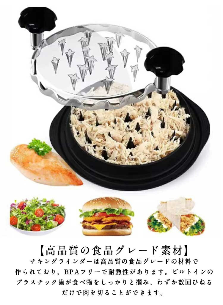チキンシュレッダー 鶏胸シュレッダー ツールツイスト クリアカバー付き ミートシュレッダー 滑り止め チキングラインダー 豚肉 牛肉 チキン 食洗機対応 人間工学ハンドル ねじれ 透明蓋 耐熱 ツール
