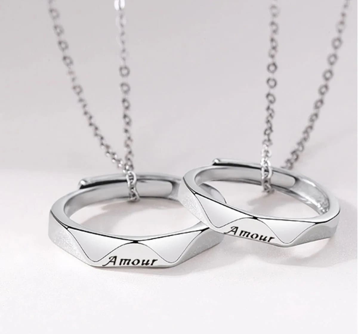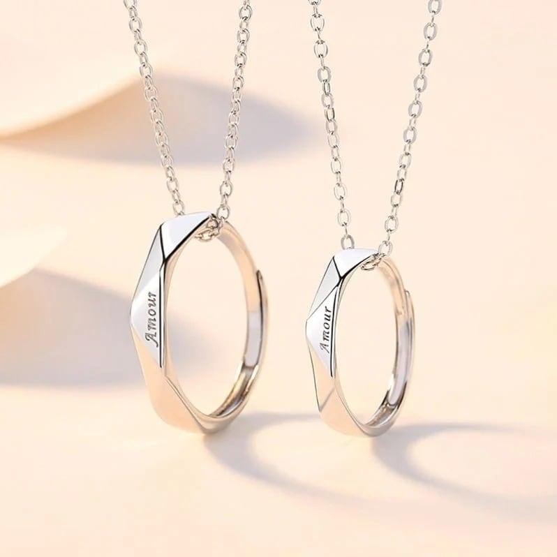 シンプルで着け心地の良い、シルバーリング、レターリング、チェーンがセットになったペアネックレスです フリーサイズなので、記念日やカップル、お揃いのギフトをお探しの方にも最適です