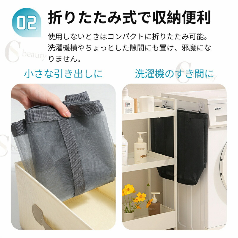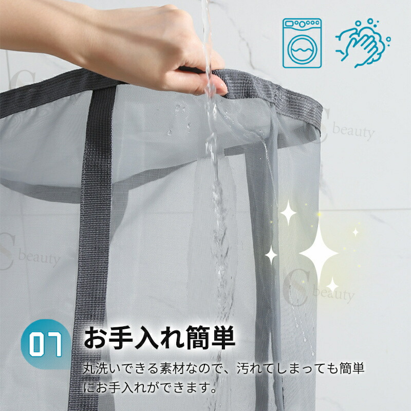 ランドリーバスケットはメッシュ素材を採用しており、通気性が良く、湿気やニオイがこもりにくく、清潔に使えます。