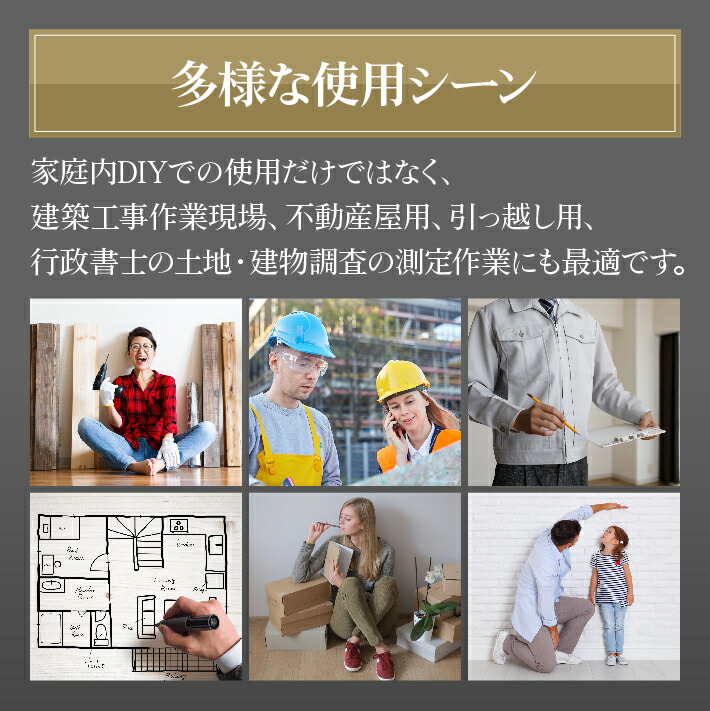 光により測定対象を当たるだけて長さを瞬時に獲得することができ、メジャーを伸ばしにくい場所でもスッとすぐに測れます。2人必要の協力巻き尺測定より、測定は一人でも気楽に行えます。使用範囲が広いので、巻尺メジャーに代わる新しい生活必需品となります。