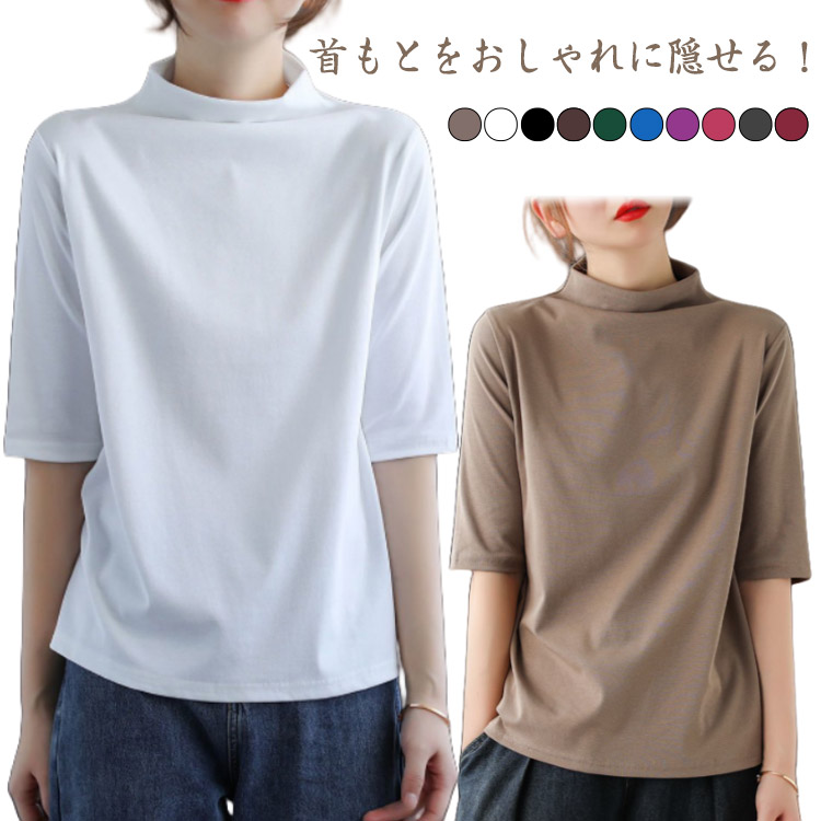 5分袖 首もとをおしゃれに隠せる ハイネック tシャツ 紫外線対策 ゆったり レディース ボトルネック 夏服 uvカット おしゃれ カットソー 首元保護 ハイネックtシャツ