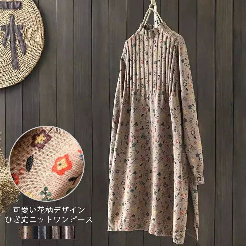 レディース 50代 秋冬 チュニックワンピース きれいめ ニットワンピース 膝丈 膝下 チュニック 花柄 大きいサイズ 膝丈ワ ワンピ