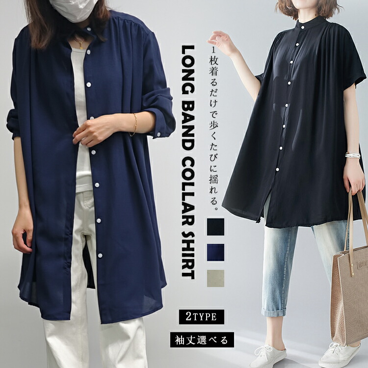 チュニック 半袖 バンドカラーシャツ レディース 夏 秋 ロングシャツ 羽織り バンドカラー スタンドカラーシャツ ふんわり 体型カバー 半袖シャツ 長め ギャザー 大人 通勤 シャツチュニック
