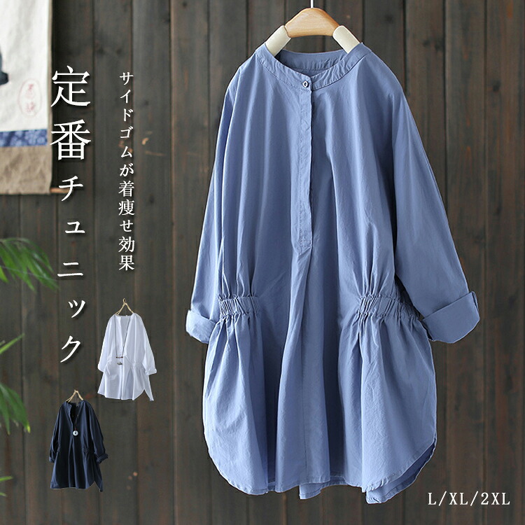 バンドカラー シャツ ブラウス レディース チュニック 長袖 スタンドカラー 長袖ブラウス ハーフボタン ゆったり ゴム入り バンドカラーシャツ 大きいサイズ トップス ロングブラウス プルオーバー