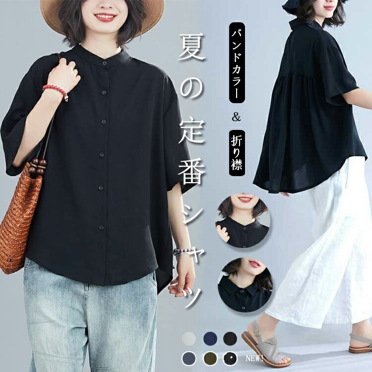 【翌日発送!】バンドカラー シャツ 夏 襟付き 半袖シャツ シャツブラウス ワイシャツ スタンドカラーシャツ 5分袖シャツ ドロップショルダー フォーマル 薄手 立ち襟 2