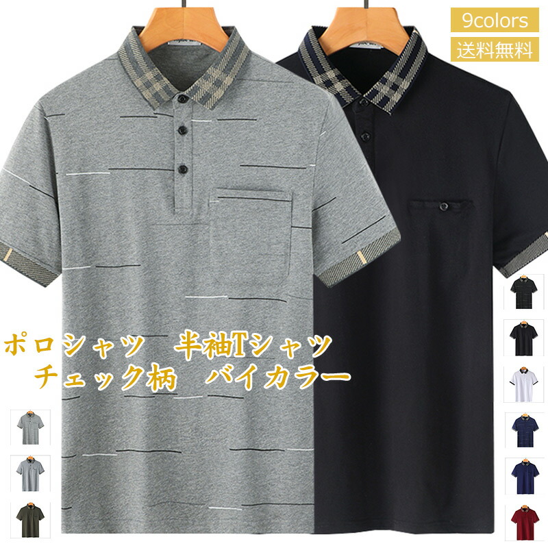 シャツ ポロシャツ メンズ 半袖 半袖ポロ ゴルフ 半袖Tシャツ チェック柄 無地 男性用 バイカラー ポロネック ボタン付き 胸ポケット付きと飾りポケットの2種類あり トップス ゆったり