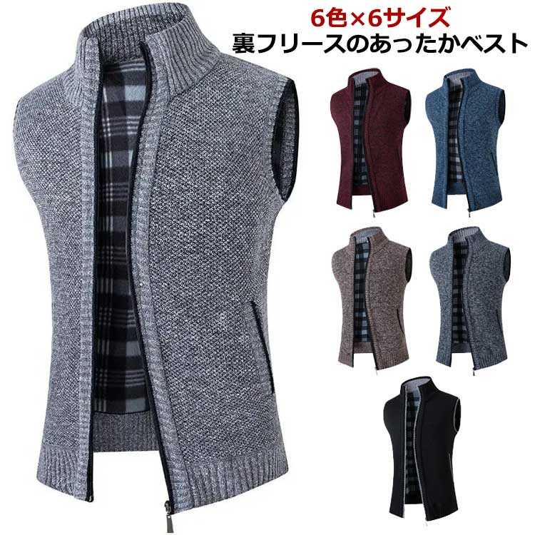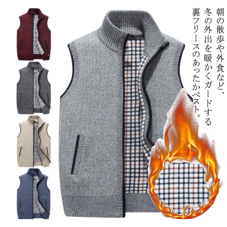 ニットベスト メンズ 男性 裏地フリース 厚手 前開き ファスナー 袖なし ノースリーブ 立ち襟 スタンドカラー ポケット付き あたたかい おしゃれ かっこいい 高齢者 普段着 部 シニアファッション