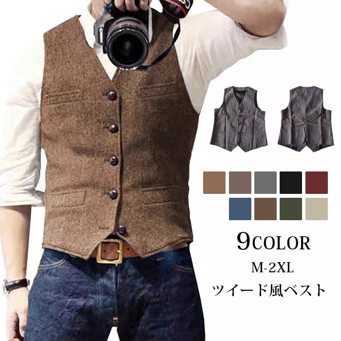ベスト メンズ スーツ ジレ ツイード ウール スリム 大きいサイズ シングル 細身 ビジネス 結婚式ベスト フォーマル 紳士 卒業式 男性用 春 夏 秋 ールドアメリカン アメカジ プレゼント 冬