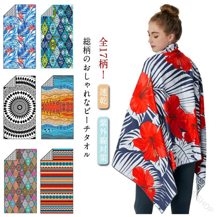 軽量で速乾性に優れ紫外線対策もできる総柄ビーチタオル レジャーやプール リゾート サーフィンに最適な大判サイズ