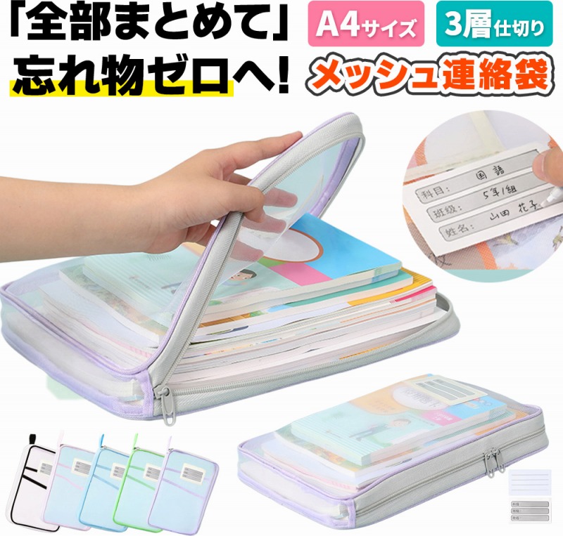 連絡袋 A4 ナイロンメッシュ 縦型書類ケース 仕切り付 大容量 筆箱 ケース ファイル 教科書 ワークブック プリント 整理 収納 学生 小学生 中学生 高校生 子供