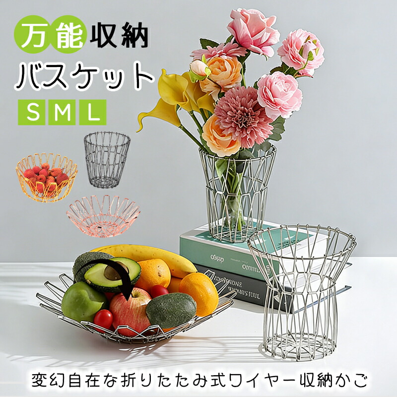 フルーツバスケット 変形 ステンレスバスケット 果物かご ワイヤーバスケット ワイヤーボウル 折りたたみ バスケット フルーツボウル 変化に富む収納かご ディスプレイ 丸型 フルーツトレイ おし 花瓶
