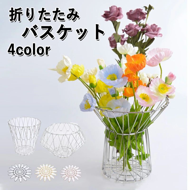 ステンレスバスケット 変形 折りたたみ式 ワイヤーバスケット 収納かご 花瓶代わり 省スペース コンパクト収納 断熱マット ステンレスワイヤー メタルバスケット おしゃれ 通気性 玄関 キ 見せる収納