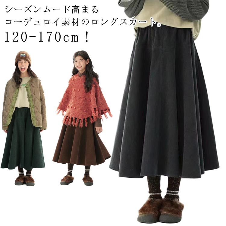 春 スカート ウエストゴム こども服 ロングスカート 秋冬 Aラインスカート コーデュロイ おしゃれ 無地 ボトムス ナチュラル シンプル 子供服 ジュニア 140 キッズ 体型カバー 子 女の子